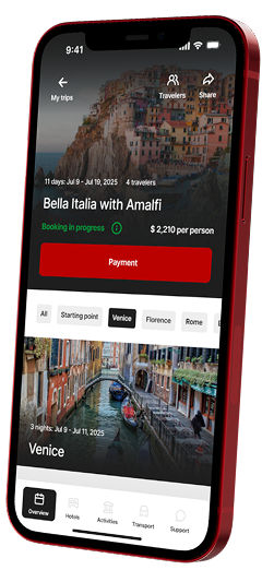 With the Firebird App, you can create and book your dream Italy itinerary in just a few clicks. Discover ready-made journeys or create your own from scratch, receive instant quotes and confirm everything in one place. Need advice? Chat directly with a dedicated travel specialist to perfect every detail.